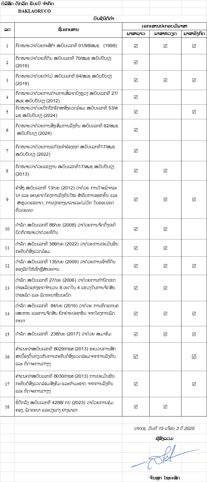 ນີ້ແມ່ນຫຼັກຖານຂອງການປະຕິບັດຕາມມາດຕະຖານ FSC ຂອງບໍລິສັດ ດັກລັກ ຣັບເບີ ຈຳກັດ (DAKLAORUCO)