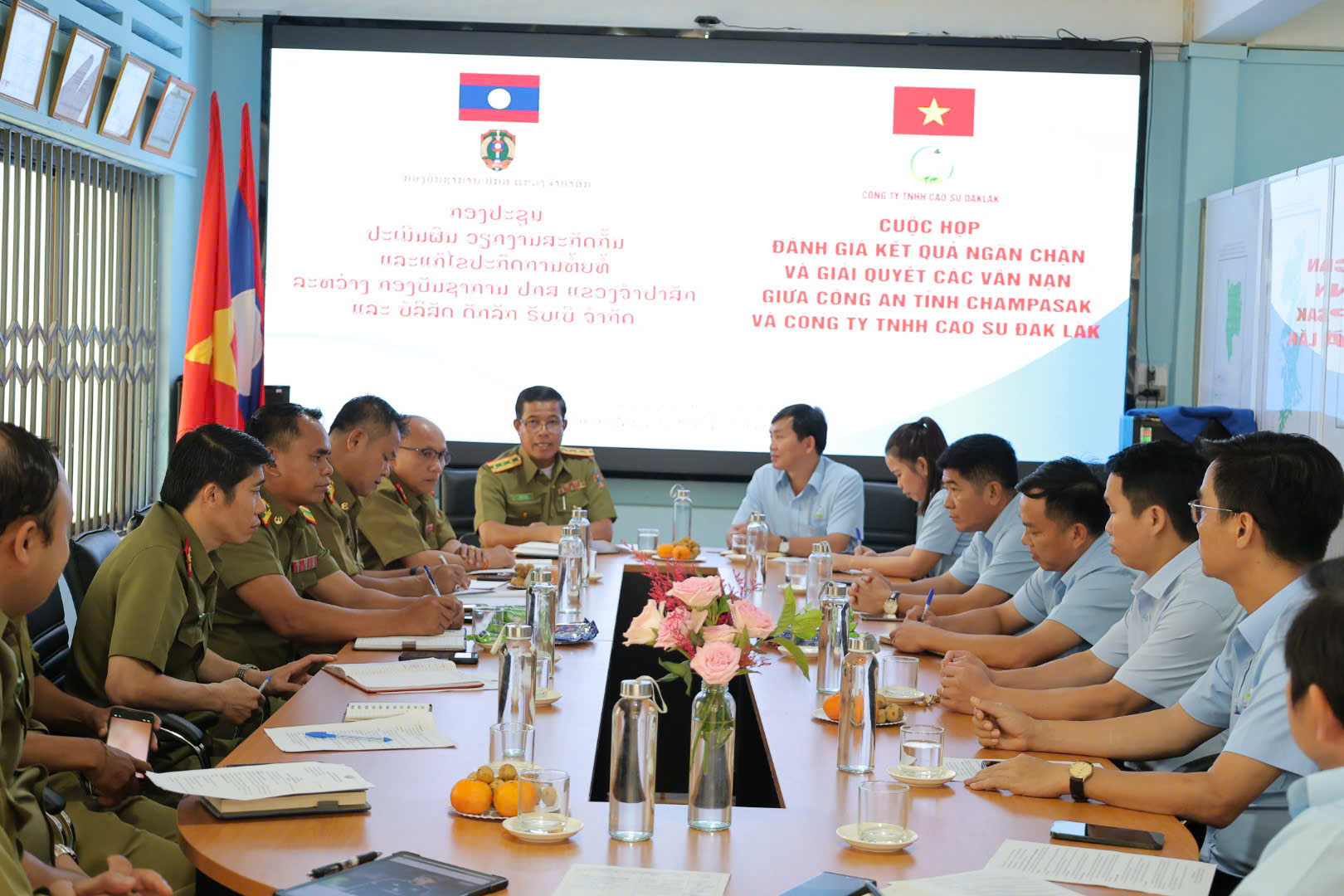 CUỘC HỌP ĐÁNH GIÁ KẾT QUẢ NGĂN CHẶN VÀ GIẢI QUYẾT CÁC VẤN NẠN GIỮA CÔNG AN TỈNH CHAMPASAK VÀ CÔNG TY TNHH CAO SU ĐẮK LẮK